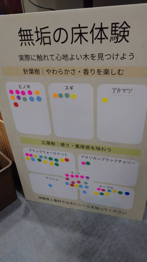 無垢の木体験をやりました。どの木がお好みか触ってみて選んで頂きました。
